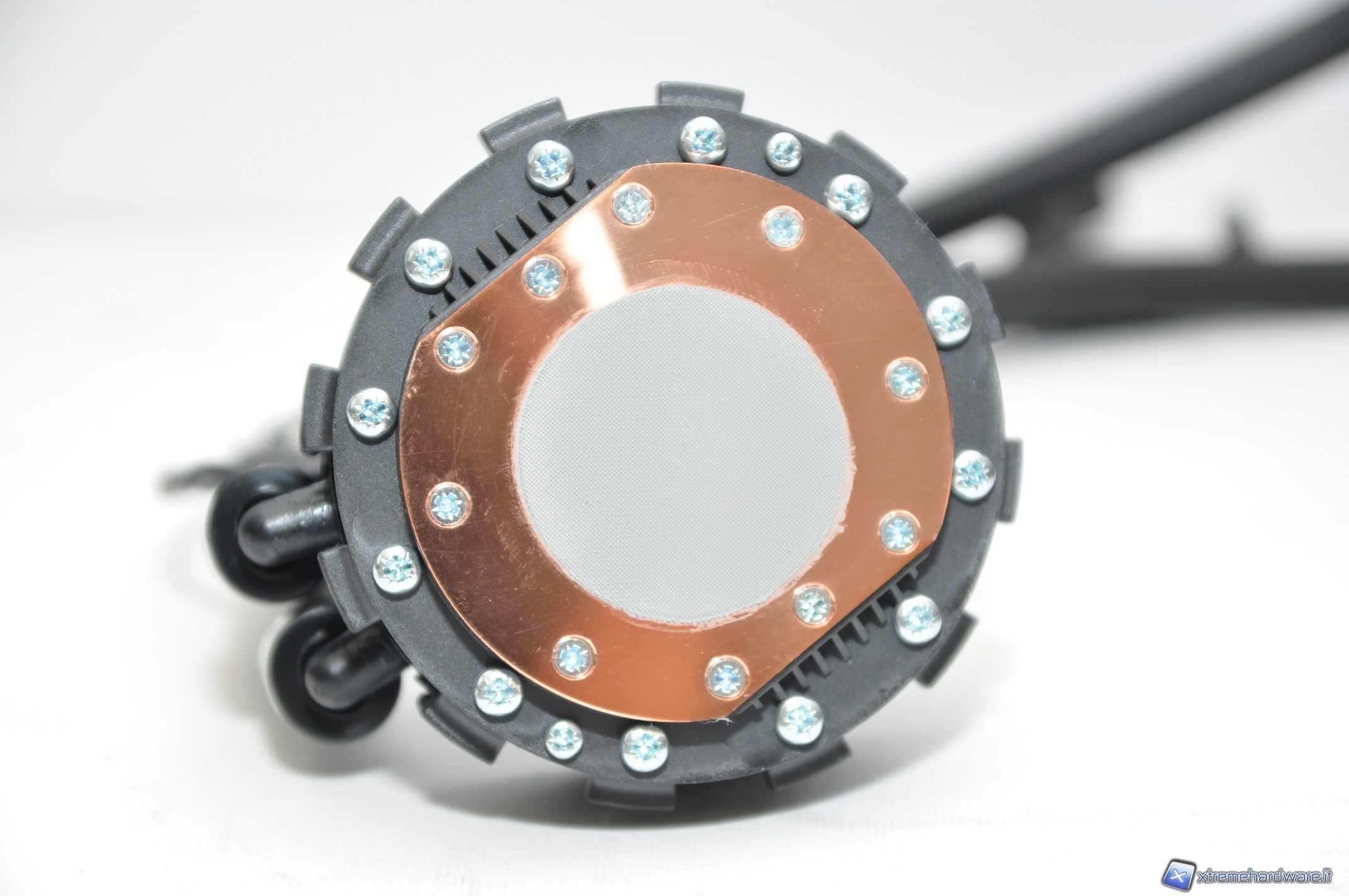 Il dissipatore, per chi non conoscesse la tipologia in questione, si presenta come un corpo radiante della larghezza ed altezza grossomodo di una singola ventola da 120mm, questo significa che sarà compatibile con la quasi totalità dei case ATX. Lo spessore del radiatore è di soli 27mm, rendendo l’installazione molto più agevole rispetto al KÜHLER 920. Dal radiatore partono due tubi contenenti del liquido refrigerante, sostanzialmente acqua e sostanze sia anticorrosive che antibatteriche, che finiscono la loro corsa all’interno di una struttura circolare, costruita dall’eccellente ditta Asetek, che funge sia da waterblock che da pompa. Le particolarità di questa soluzione sono molteplici, ma andiamo per ordine: